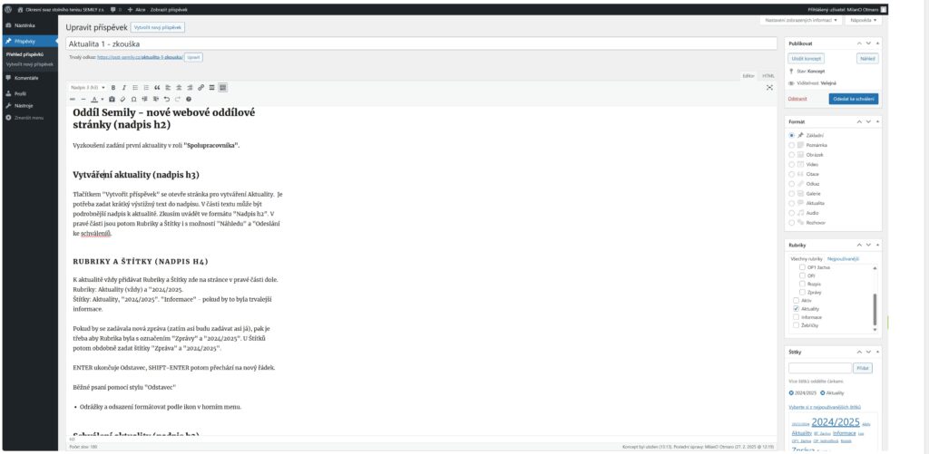 V části pro psaní příspěvku je potom potřeba zadat krátký výstižný text do nadpisu. V části textu může být podrobnější nadpis k aktualitě. Zkusíme uvádět ve formátu „Nadpis h2“.