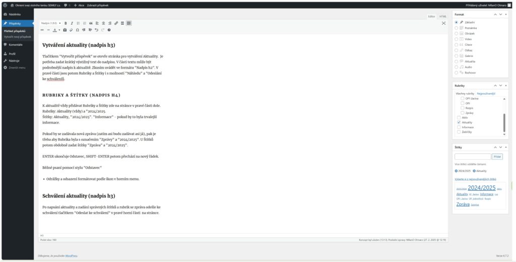 Pokud by se zadávala nová zpráva (zatím asi budu zadávat já), pak je třeba aby Rubrika byla s označením „Zprávy“ a „2024/2025“. U Štítků potom obdobně zadat ŠTÍTKY „Zpráva“ a „2024/2025“. Je to důležité pro další zobrazování zpráv v menu i na celém webu