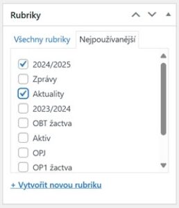 • Rubriky – odznačit „Uncategorized“ a označit „Aktuality“, „2024/2025“